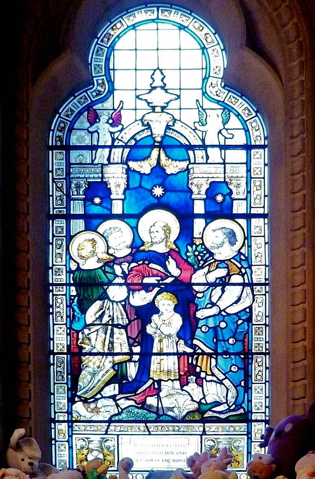 St Christopher's Chapel, apse windows, by Clayton & Bell. All the windows in the chapel of Great Ormond Street Hospital for Sick Children, designed by E. M. Barry, are contemporary with the chapel itself and date from 1875 (see Eberhard). They feature children as part of an iconographic scheme encompassing both Old and New Testaments, and are part of the whole decorative project for which Clayton & Bell were responsible. The seven windows here are "set in pointed arch recesses" (listing text) and show the central episodes of the scheme, illustrating the infancy and childhood of Jesus: the Nativity, the Adoration of the Shepherds, the Adoration of the Magi, the Presentation of the child Jesus in the Temple, the flight to Egypt, Jesus with the doctors in the temple, and the Holy Family. Soft toys rest on the ledges below them, left by parents in memory of individual children.