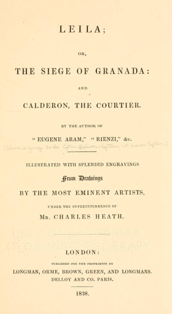 Bulwer-Lytton, Edward. Leila, or the Siege of Granada. Paris: A. and W. Galignani, 1838. Original edition, London: Longman, Orme, Brown, Green and Longmans, 1838.