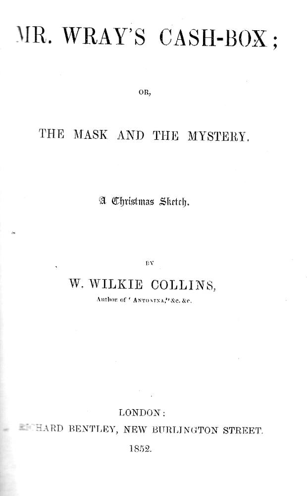 Collins, W. Wilkie. Mr. Wray’s Cash-Box; or, The Mask and the Mystery. A Christmas Sketch. Frontispiece by John Everett Millais. London: Richard Bentley, 17 December 1851. [Dated 1852]. vii + 1-171.