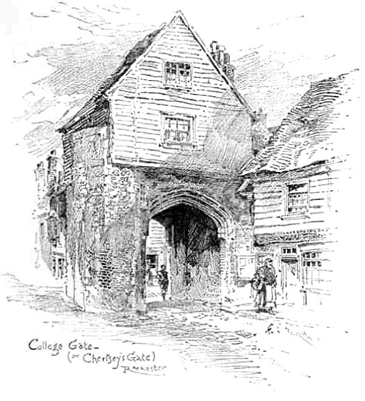 Dating from the early fifteenth century, the gatehouse is the bachelor flat of Cathedral organist John Jasper in Dickens's last novel. Dickens features Chertsey's Gatehouse prominently among the "Cloisterham" locales of The Mystery of Edwin Drood (1870). Its open portal leads from the hustle and bustle of the commercially-oriented High Street of Rochester into the comparative quiet of the great Cathedral in an area known as the cathedral close. The timber house atop the alternating courses of local stone and flint was added when the porter's gate was converted into an actual &albeit, small — house in the eighteenth century — the Prior's Gate on the western side of the close suggests what Chertsey's might have looked like prior to that conversion.