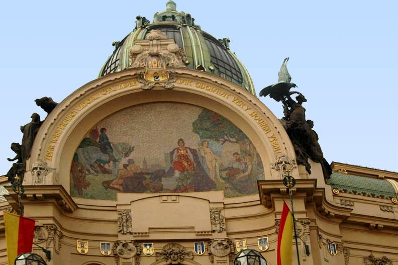 Mosaic over main entrance, The Municipal Building, Prague. Designed by Osvald Polivka and Antonin Balšánek. 1903-11. Photograph 2007 George P. Landow. [You may use this image without prior permission for any scholarly or educational purpose as long as you (1) credit the photographer and (2) link your document to this URL.]