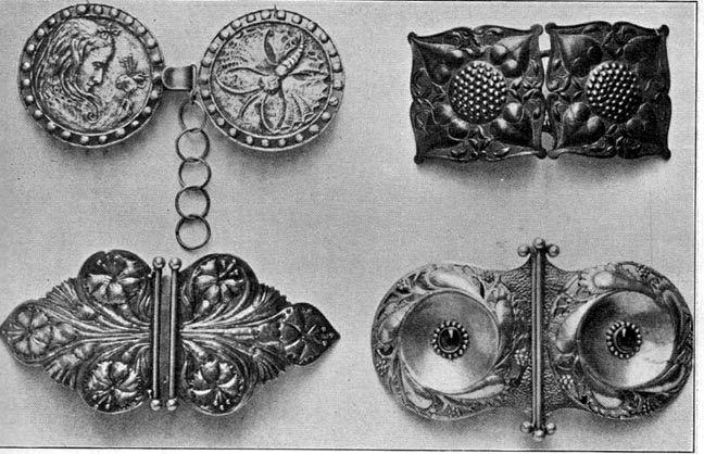 Cuatro ganchos diseñado por C. R. Ashbee y fabricado por the Guild of Handicraft. c. 1897. Fuente: The Studio. El escaneo de imagen y texto por George P. Landow. [Esta imagen se puede usar sin autorización previa para cualquier propósito académico o educativo, siempre y cuando mencione (1) el nombre de la persona que esta imagen escaneada y (2) enlace el documento a esta dirección URL.]