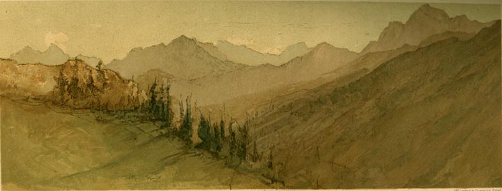 Montañas del lago de Annecy por John Ruskin, 1819-1900. Acuarelas. Fuente: Obras, XVII, frente a lxxxi. La imagen escaneada, texto, traducción por George P.Landow Esta imagen se puede usar sin autorización previa para cualquier propósito académico o educativo, siempre y cuando mencione (1) el nombre del fotógrafo y (2) enlace el documento a esta dirección URL.