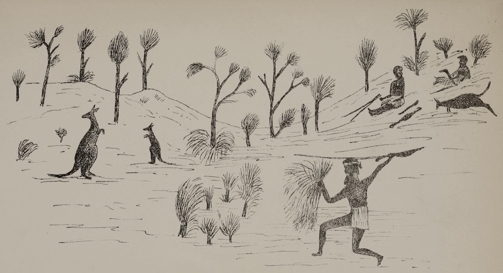 Left: Native encampment, Taplin, facing p.56. Right: Hunting Scene, Taplin, facing p. 40. Both drawn by Yertabrida Solomon, an aboriginal from Coorang, in 1876.