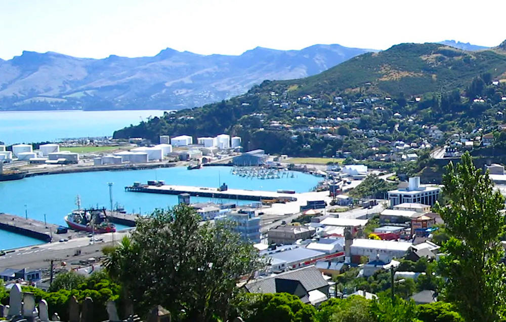 Lyttelton, South Island, New Zealand, cropped from the image in the Encyclopædia Britannica website, under the terms of the GNU Free Documentation License.