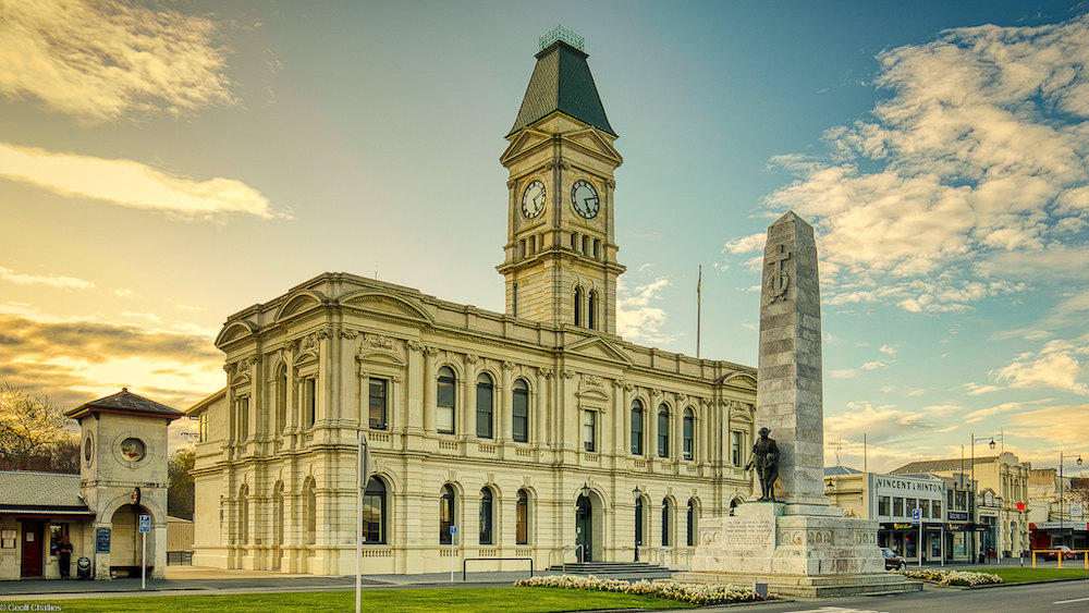 "Oamaru Sunset" by Geoff Challies, taken on 16 September 2022 and kindly made available on Flickr under the terms of the Attribution 4.0 International CC BY 4.0 Deed. This is the old Chief Post Office building, designed by Glasgow-born Thomas Forrester (1838-1907), and opened in 1884. The clocktower was added in 1903. It is now used by the Waitaki District Council. Here, Oamaru limestone is shown off to its full advantage.
