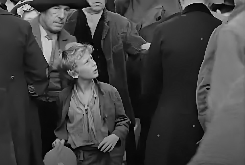 A confused Oliver is surrounded by a milling crowd; Lean compresses the space to make the scene claustrophobic and oppressive, as seen from the character’s point of view.