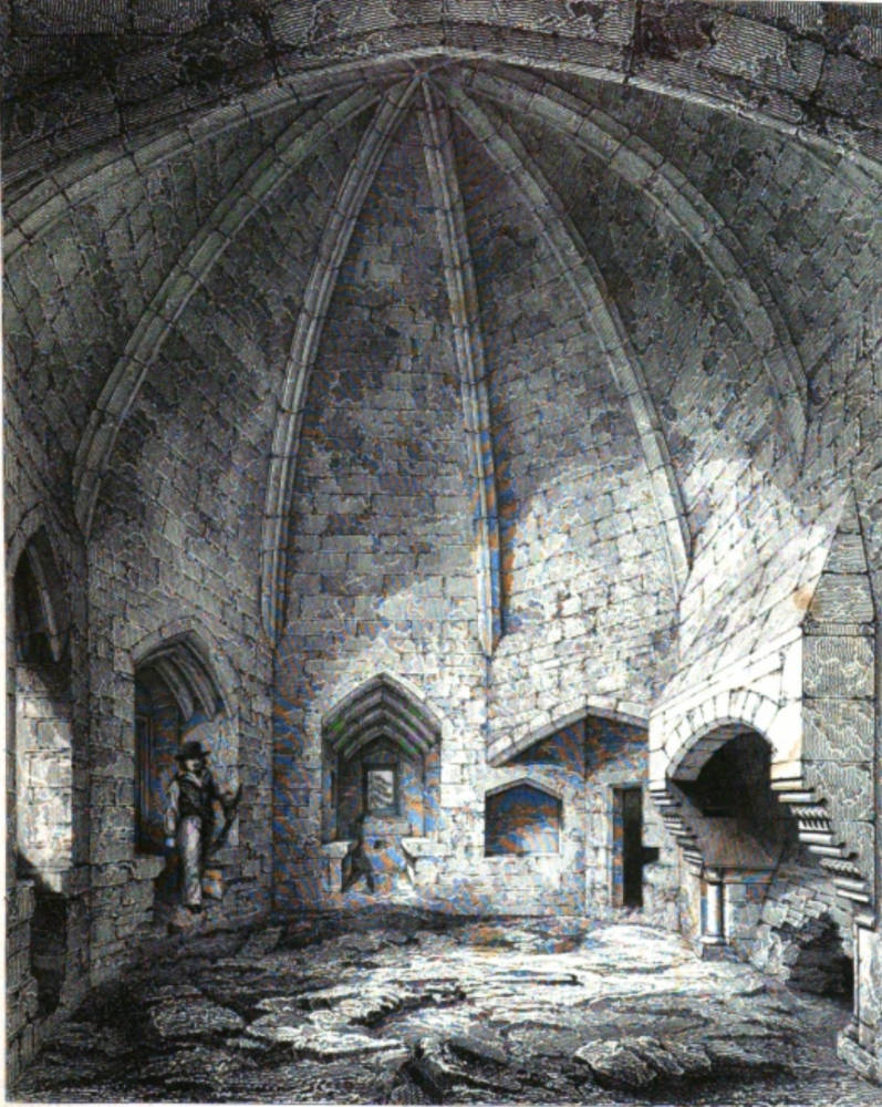 The greater proportion of the interior of the building yet remaining consists of vaults. Of the portions above the level of the rock, a few turnpike stairs and small chambers, in the intricacies of the masonry between the larger apartments, only remain. The hall, which seems to have been of great size, is rooñess, and covered with thick grass. At its extremity is to be found the only piece of ornament, unless, perhaps, a slender moulding, which the edifice supplies,-the canopied seat represented in thc subjoined cut, which yet would hardly be deemed worthy of admiration, if it were found in an ecclesiastical instead of a baronial building.