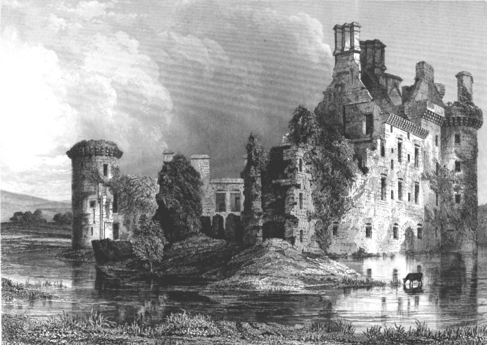 The Scottish reiver, or free-booter, usually perched his stronghold on the top of an isolated rock or by the edge of a ravine; and he derived so much security from these natural peculiarities, that they came to be considered indispensable to a real fortress. It must have been seen, however, that in England, where a rocky foundation could more rarely be obtained, the great fens and morasses afforded a means of protection from hostile invasion, as effectual as precipices or torrents; and occasionally we find, in Scotland, defensible positions of this character successfully adopted. Thus the flat sandy shores of Dumfriesshire could boast of at least one strong position which, close to the junction of two rivers, had the swelling Solway on one side, and the pathless wastes of Lochar Moss on the other. It was important that the peninsula thus guarded from without should be internally commanded by a fortified place, and thus, from a very early period rose the towers of Caerlaveroc, “not many feet above high-water mark” (New Statistical Account — Dumfries, 351). The extent to which the available materials of a flat site near abundance of water had been adapted to defensive purposes, is indicated by the ample remains of the old moats, whence the people of the country call the spot the Island of Caerlaveroc. The great gateway pierces a narrow curtain between two machicolated round towers of old baronial architecture; and one of the round towers at the other two angles of the triangular plan to which the edifice was adjusted, still remains. A considerable portion of the intervening buildings have the canopied and sculptured window cases of the domestic architecture of the reign of James VI., and remind one of Linlithgow Palace and Heriot's Hospital.