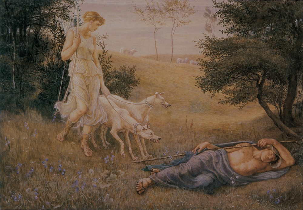 Diana and Endymion [Diana and the Shepherd] by Walter Crane, RWS (1845-1915). 1883. Watercolour and gouache on paper. 21 ¾ x 30 ¾ inches (55.3 78.1 cm). Image courtesy of Dundee Art Galleries and Museums, reproduced for purposes of non-commercial academic research. [Click on the image to enlarge it.]