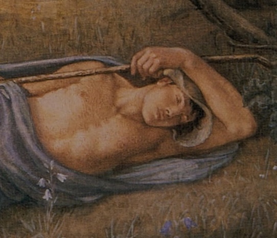The subject of Diana and Endymion was a favourite with Old Master painters. In the Victorian era the most famous version was by G.F. Watts who exhibited his Diana and Endymion at the Grosvenor Gallery in 1881, no. 56 [see also an etching of it]. This was quite a different composition to Crane's, showing the goddess hovering above the sleeping shepherd. Watts had done an earlier version, c.1869, a different composition again , which was in the Cecil French Bequest to the Fulham Public Libraries, but is now the property of the London Borough of Hammersmith & Fulham. Edward Poynter did a much later version of this subject in 1901-02, now at the Manchester Art Gallery. Poynter's version is based on John Keats's poem "Endymion" and Diana is portrayed nude, except for a large fluttering blue scarf, and she is shown standing above Endymion. The figure of Endymion, however, is remarkably similar to that in Crane's watercolour except that the shepherd is facing in the opposite direction.