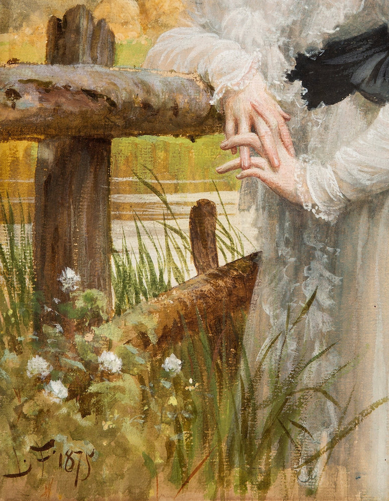 This is a wonderful Pre-Raphaelite style painting with superb detail and coloration by this important artist, known especially for his compositions and fine interpretation of dress, especially lace. He is widely regarded as one of the leaders of the Neo-Venetian School.