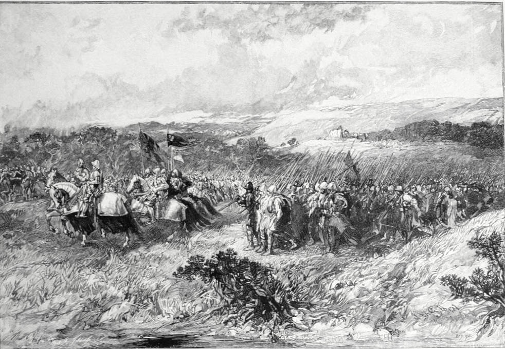 Crusaders on the March. Sir John Gilbert (1817-1897). Oil on canvas. Engraved by Madame Jacob-Bazin. “In the South Kensington Museum.” Source: Magazine of Art, 61. Click on image to enlarge it.