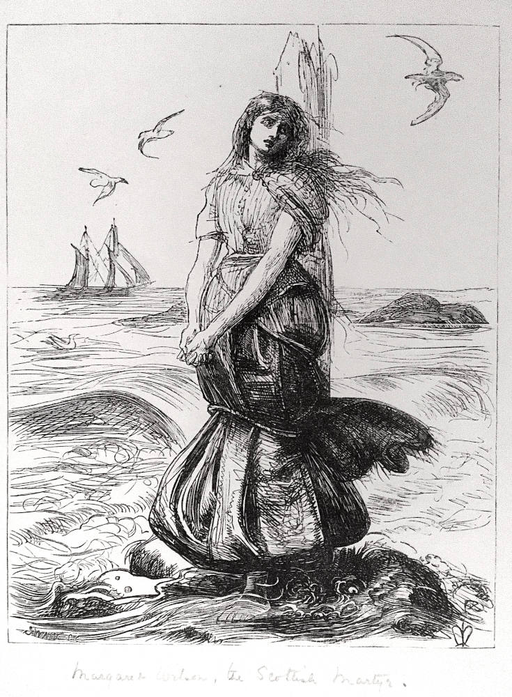 John Everett Millais most famously treated this subject, initially in a wood engraving published in Once A Week, Volume VII, on July 5, 1862, page 42. In 1871 Millais did an oil painting of this subject entitled The Martyr of Solway that is now in the collection of the Manchester Art Gallery. Waterhouse was obviously inspired to paint this subject based on Millais’ examples, but was more influenced by the early print than the later painting.