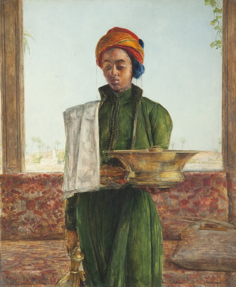 With eyes cast down and a solemn countenance, this servant spares the modesty of those on whom he attends, and appears himself as a model of perfect refinement. The rich brocade of the couch behind him, the tailored cut and deep colour of his costume, and the gleaming brassware, all suggest a lavish setting. — Jacqueline Banerjee.