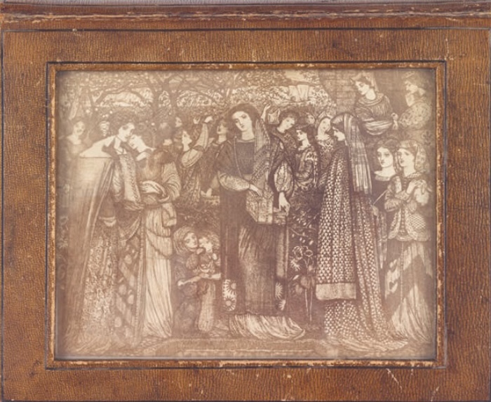 This narrative of influence continues with one of my favourite objects from the entire exhibition – our star item, the Little Holland House Album (1859), lovingly prepared by Edward Burne-Jones and gifted to Sophia Pattle (later Dalrymple) in gratitude of their time spent together in Sara Prinsep’s home. This was in the year of the " great stink" on account of sewage impacting the smell from the River Thames. Suffering from overwork and nervous exhaustion, Burne-Jones came into Sara’s care in much the same fashion as Watts had ten years prior. Considered "the greatest genius of the age" and yet "shy, delicate and without any visible signs of female support," Burne-Jones entered the Prinsep household to convalesce (Burne-Jones 8). From this time, he produced an album rich in medieval-inspired illustrations, poems and stories centred around the theme of courtly love with the young artist sketching a dedication to Sophia onto the final page alongside notes of music and her insignia. Thus, whereas Sara exerted a motherly influence and patronage, Sophia became something more romantic. The album, therefore, is both synonymous of the Pattles’ influence over Burne-Jones and the formation of his early Pre-Raphaelitism. Lent from a private collector, this album has been rarely exhibited so we are very lucky to be able to display it.