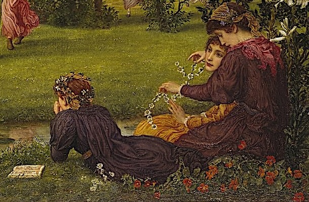 Despite the beauty of this work Rooke did not exhibit it at either of the principal London venues of the time, the Royal Academy or the Grosvenor Gallery. This idyllic scene features two groups of maidens in classical costumes in the midground who dance in a circle holding hands in the yard of a grand house. Some of the dancers face inwards towards the circle while others face outwards towards the spectators. In the left foreground a girl dressed in a dark red gown plays on a pipe. In the right foreground two seated young women construct a daisy chain next to a clump of white lilies, while a young girl who was lying down reading an illuminated book pauses to observe the dancers. In the language of flowers white daisies signify purity and innocence while white lilies signify a chaste life. This group of young women is separated from the dancers by a narrow stream. In the background is an Italianate-style villa surrounded by trees and with low hills in the background. By 1882 Rooke had already made a number of visits to Italy on behalf of his patron John Ruskin so he would have been very familiar with such architecture and landscape.