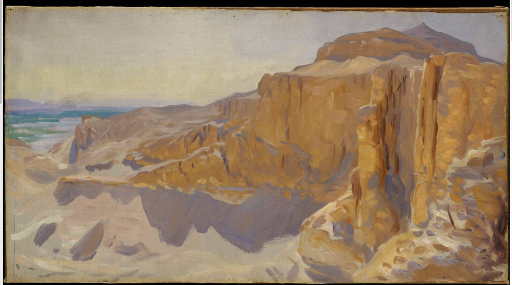 Cliffs at Deir el Bahri, Egypt. John Singer Sargent. 1890-91. Oil on canvas, 13 3/4 x 24 3/4 in. (34.9 x 62.9 cm). Courtesy of the Metropolitan Museum of Art, New York (50.130.24), Gift of Mrs. Francis Ormond, 1950. Click on image to enlarge it.