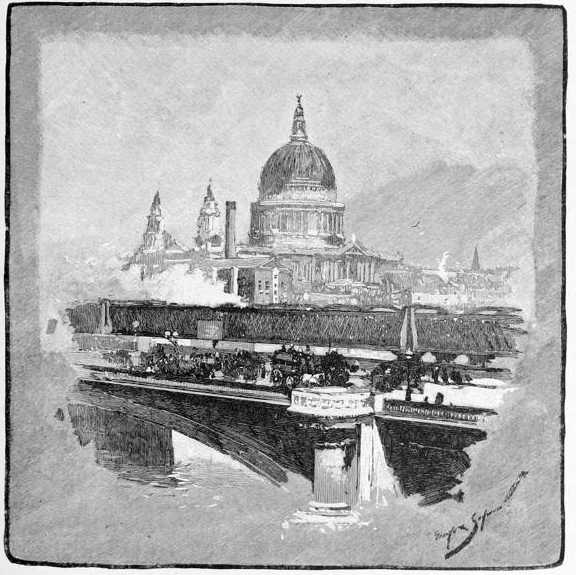 We shall not attempt to skip the bridge at Blackfriars. It is beautiful enough in itself, but in hideous proximity to one of those ghastly iron structures which only railway companies are privileged to build, and which, even to them, are only permitted in America and in England. In passing one ought to note that near the end of Blackfriars Bridge, and near the spot on which it is now proposed to build a fish market, there stood the theatre in which many of the plays of Shakespeare, and Ben Jonson, and Beaumont and Fletcher, were first performed. Shakespeare himself must many a time have visited this neighbourhood, and doubtless has freciuently enough wandered round the spot on which in these days stands the office of the Times. Blaclrfriars, indeed, is rich in literary associations, and in spite of the iron horror aforetold, to skip it were impossible. Here, according to Pope, was the centre of the Empire of Dulness, for here the Fleet river, now running underground, empties itself into the Thames; and it was