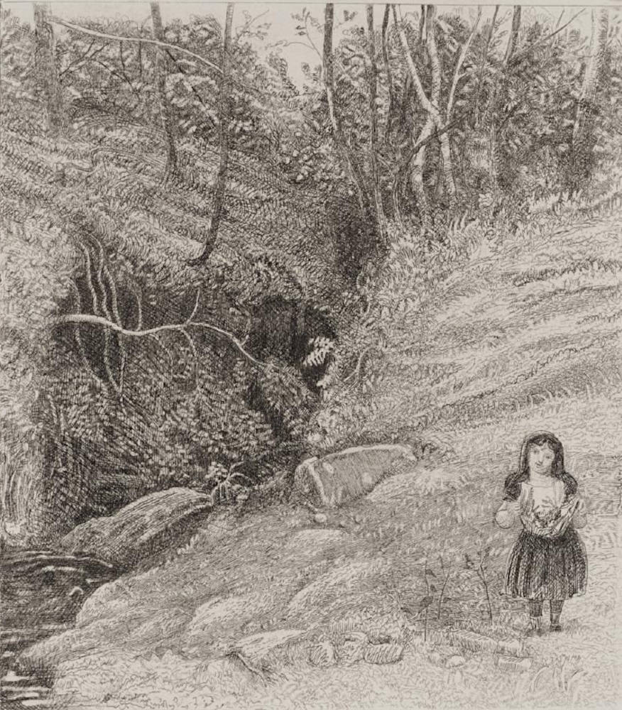 This etching portrays a stream with wooded banks and in the foreground a young girl carrying sticks in her pinafore.