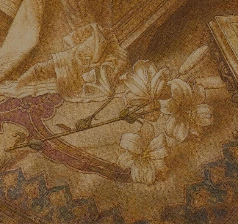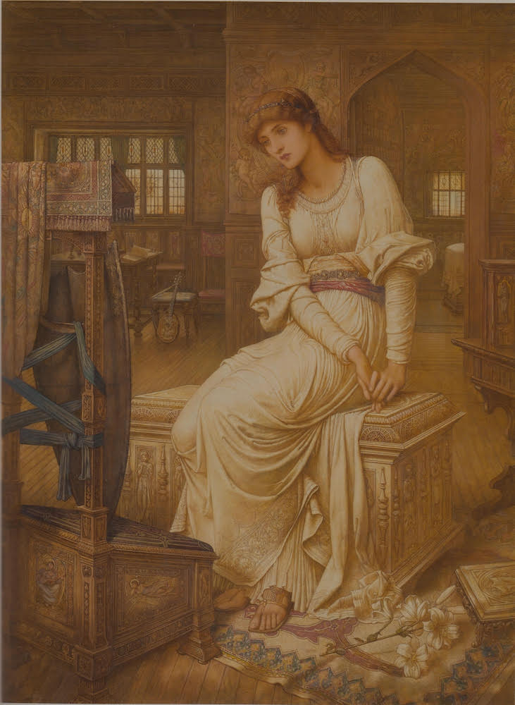 In Strudwick's version of the subject, Elaine is shown in the private apartment of her father's castle of Astolat. Seated on a carved wooden coffer, she looks intently at the shield of Lancelot, which she has placed on a prie-dieu (as if it were some kind of holy relic). With it is shown part of the embroidered drapery that Elaine had made to keep and protect the shield. Lying at her feet is a lily, the flower of martyrdom with which her legend has been associated since Malory told her story in Morte D'Arthur, and from which she took her name the Lily Maid of Astolat. In the treatment of her anguished expression, and in the way she clasps her hands, Strudwick captures the agonising torment of one who is hopelessly in love, and thus anticipates the tragic consequences of that love. [38 & 40]