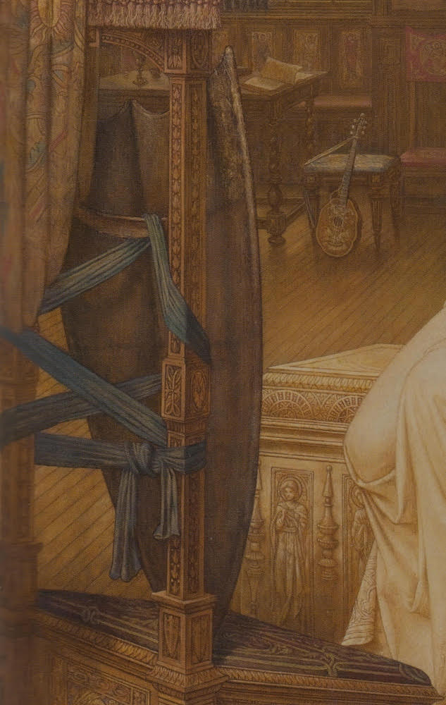 The open book and the abandoned lute allude to the hours spent by the young girl imagining the prowess of her hero as she gazes fixedly at his shield. But the prie-dieu with its precious shield now inspires a different kind of devotion, emblematic of the ravages of love. Elaine is no longer a happy child. Rejected by Lancelot, her only thought is, "O love, if death be sweeter, let me die." She addresses him with a simple, direct force, "I have gone mad. I love you: let me die." Against the muted tones of the interior, lit by diffuse golden-brown light, her hands and face communicate her despair as she sinks into madness. [179]