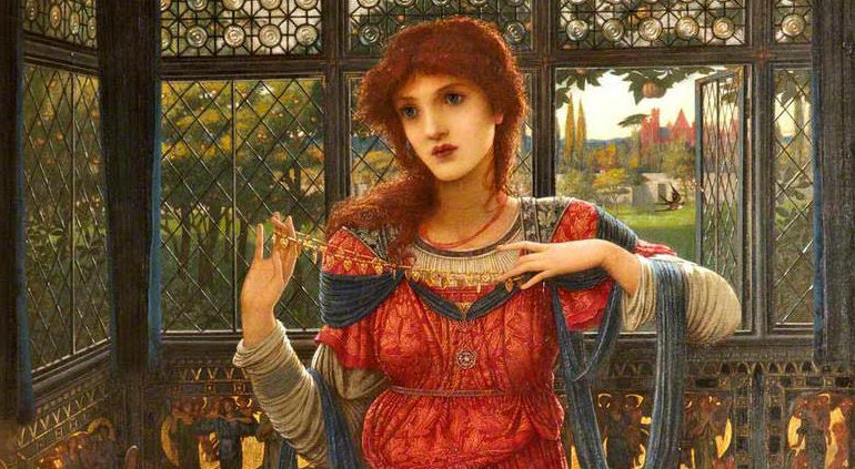 The painting shows a beautiful young woman absorbed in her thoughts, in a brilliant red and gold brocade silk dress, and seated on a window seat before a leaded-glass bay window. She is holding a golden chain with heart pendants in her hands. A swallow is flying past and delivering a message of love from an admirer. A combination of red and white roses can be seen on the window seat and lying on the floor. Red roses symbolize love, passion, and desire in the language of flowers while white roses symbolize purity and innocence. The room is filled with beautiful objects, including an illuminated manuscript, a stringed musical instrument, a hammered brass charger, and a large ornate box. The window seat is surrounded by a decorative frieze. An idyllic landscape can be seen in the background.