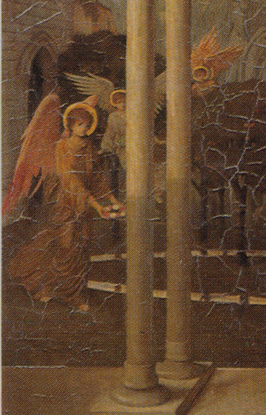 In his earliest version of this subject Strudwick depicts the youthful saint standing upright and playing a portative organ. She is wearing a red robe which might symbolize either the blood of her martyrdom shed for her faith or divine love. She is standing in a cloister, like that found in a monastery or convent, with a garden in the background. Angels can be seen to the left, although St. Cecilia appears unaware of their presence. An apple tree stands to the right, perhaps included for the apple's symbolic reference to the Trinity: the apple's three parts, the skin, the flesh, and the core containing seeds, are said to represent respectively God the Father, who encompasses all, Jesus, who is the fruit that feeds us, and the seeds, which stand for the Holy Spirit that can bring new life.