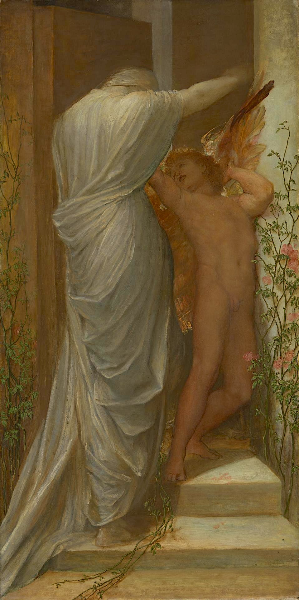 There are several versions of this painting: the grand metaphysical and deeply emotive subject preoccupied the artist over many years. The larger one in Bristol Museum & Art Gallery dates from 1875, and has a fallen stem from the climbing rose on the steps, together with the heads of several shed roses (not just rose petals). Love's wings are richer in colour. Larger still is the one that the artist himself presented to the Whitworth Collection in Machester (the very first item in the collection), which shows a dove below the steps. According to an account provided by the Whitworth’s Visitor Team, this one, "although not the earliest ... can be regarded as the principal one." Another version in AGSA, the Art Gallery of South Australia, is dated 1901, and here again there is a variation in the way the fallen roses are depicted — the stem trailing on the steps is completely absent.