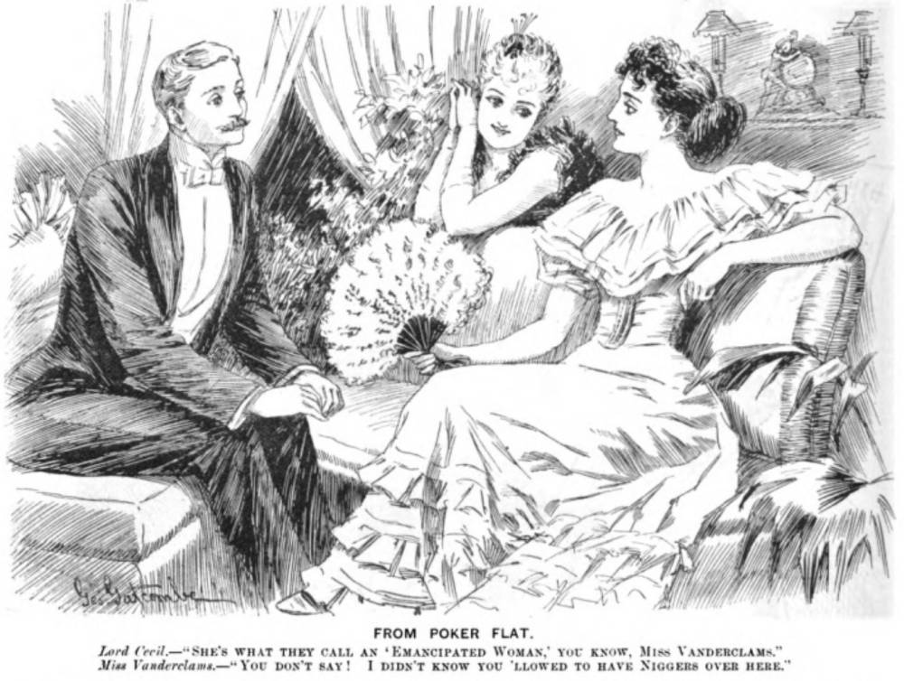 From Poker Flat. George Gatacombe. Source: Fun 57-58 (1 March 1893): 90. Click on image to enlarge it. The title “Poker Flat” alludes to Bret Harte’s short story, “The Outcasts of Poker Flat” (1869), and it imemdiately characterizes this beautiful, wealthy young woman as someone who comes from the American South — not a woman from the ante bellum South but — this is the 1890’s after all — one of those nouveau riche heiresses familiar from Victorian novels who try to climb the social ladder by purchasing a noble title with marriage to an impoverished Briton.