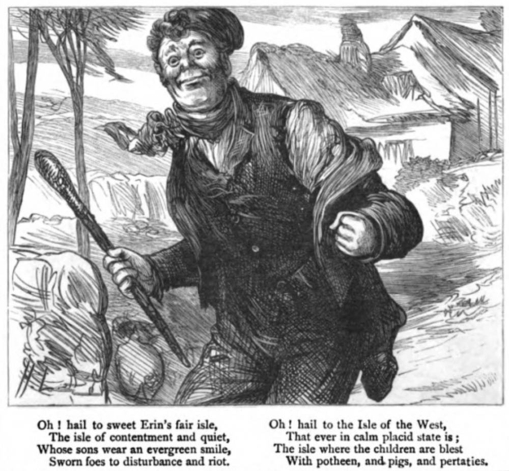 Oh! hail to sweet Erin’s fair isle. Hal Ludlow. Source: Fun Almanac 33 (5 January 1881): 13. Click on image to enlarge it. “Sworn foes to disturbance and riot” is surely ironic or even sarcastic given contemporary worries of Irish riots and violence, and more mockery appears in the assertion that Irish children are “blest / With potheen [an Irish whiskey], and pigs, and potaties [potatoes].” The last item is particularly bitter given the horrors of the potato famine four decades earlier. — George P. Landow