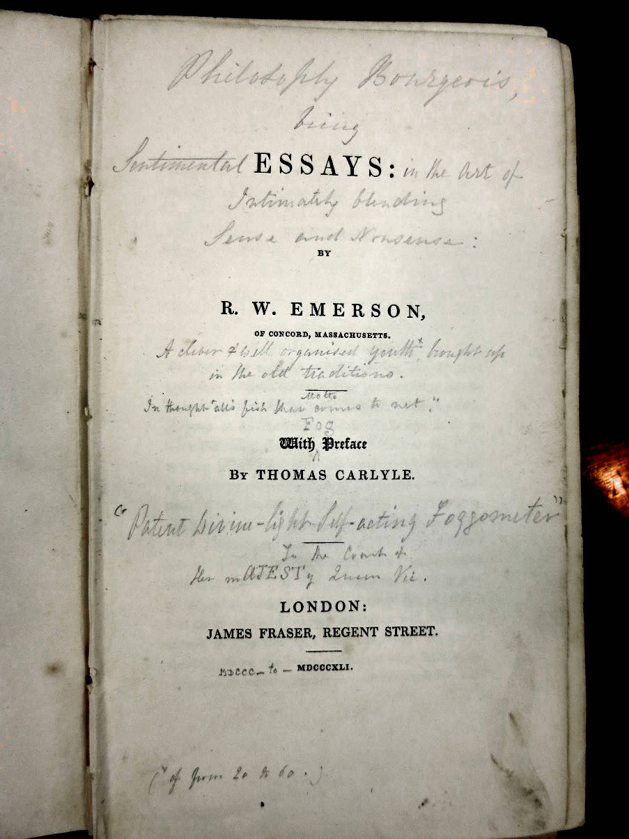 Frank Prochaska has written about these marginal annotations at length for History Today (vol. 63, 2013), arguing that their importance lies, at least in part, in correcting subsequent scholarly assumptions that because Mill published nothing about Emerson he did not know the American’s work. As it turns out, having facilitated Emerson’s initial meeting with Thomas Carlyle in 1833, Mill took an interest in the London edition of Emerson’s Essays, which included a preface by Carlyle. As evidenced by the much-altered titled page reproduced above, he found them “Philosophy Bourgeois, being Sentimental Essays in the Art of Intimately Blending Sense and Nonsense,” complete with “Fog” Preface by the “Patent Divine-light Self-acting Foggometer” himself, Carlyle. A creative compilation of his marginal notations, this summative judgment grew out of Mill’s initial reactions, such as that on p. 170, which judges the deeply earnest Emerson a “Funny man!!!!!!” and “Funny fellow!” while wondering “Is this Philosophy?” — evidently not.