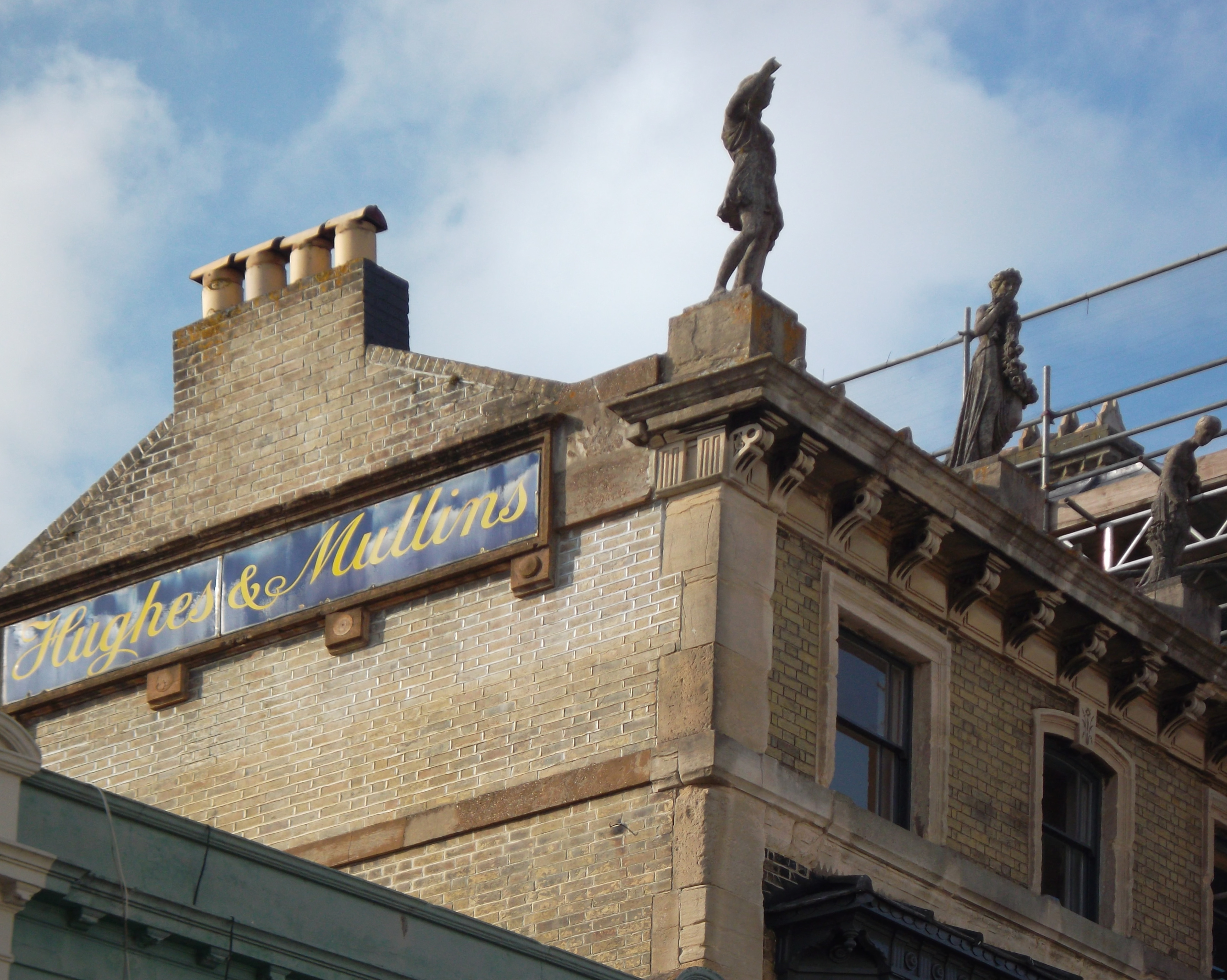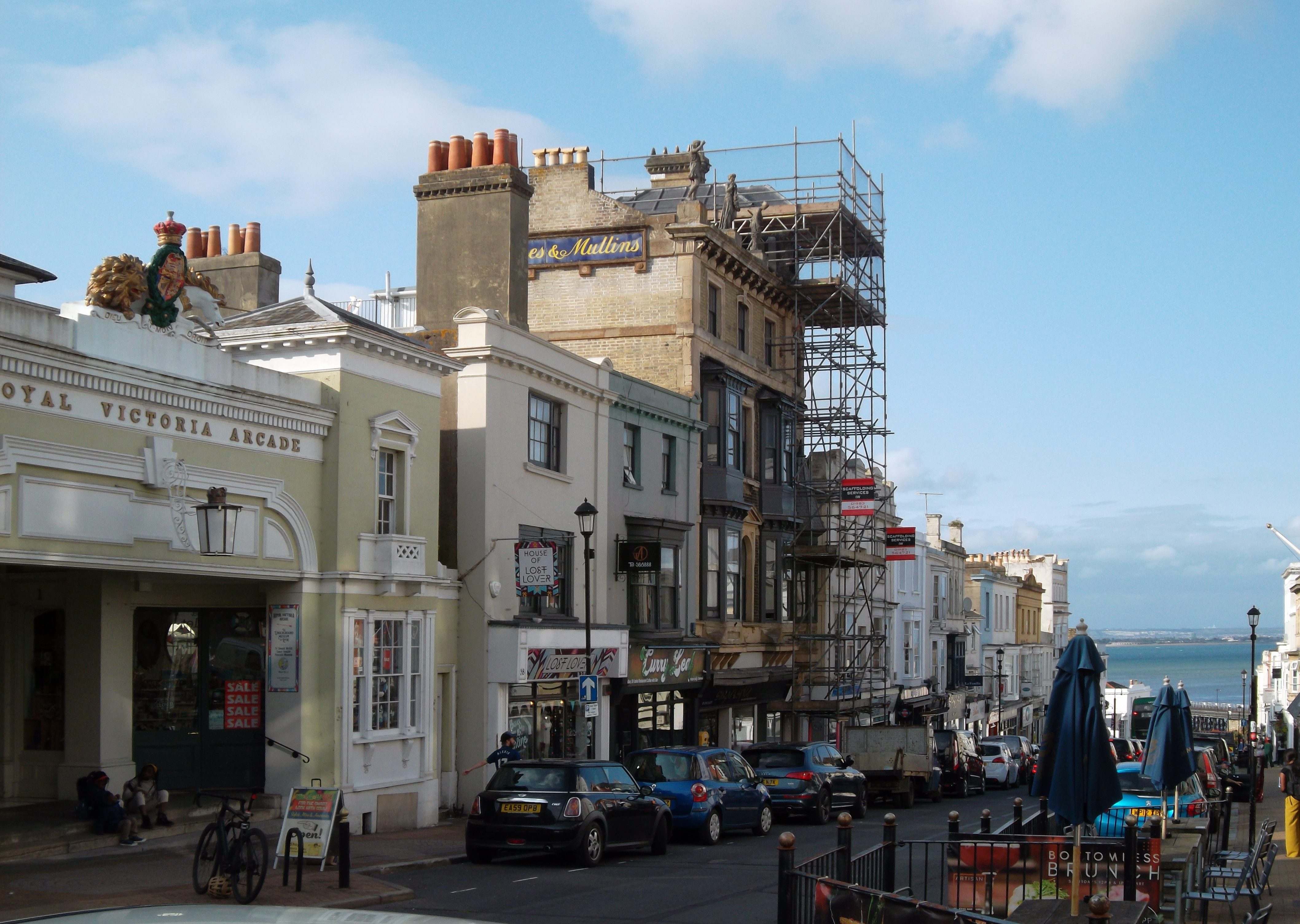 Left: The Royal Victoria Arcade on the left, with the building that once housed Hughes and Mullins's Union Street Studio further down towards the sea (at the time of the photograph, in 2024, under restoration). A glimpse of Ryde Pier can be seen at the end of the street. Right: Close-up of the photographer's sign, and part of the roof-top statuary. Photographs © Michael Riley. [You may use the photographs without prior permission for any scholarly or educational purpose as long as you (1) credit the photographer and (2) link your document to this URL or credit the Victorian Web in a print document.]