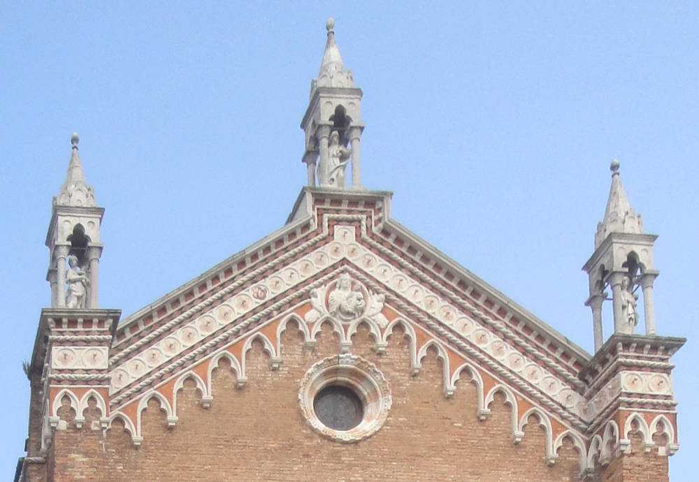 In the third and last volume of The Stones of Venice, Ruskin praises the church as “an interesting example of Renaissance Gothic, the traceries of the windows being very rich and quaint,” but he concentrates on the paintings in the church, which