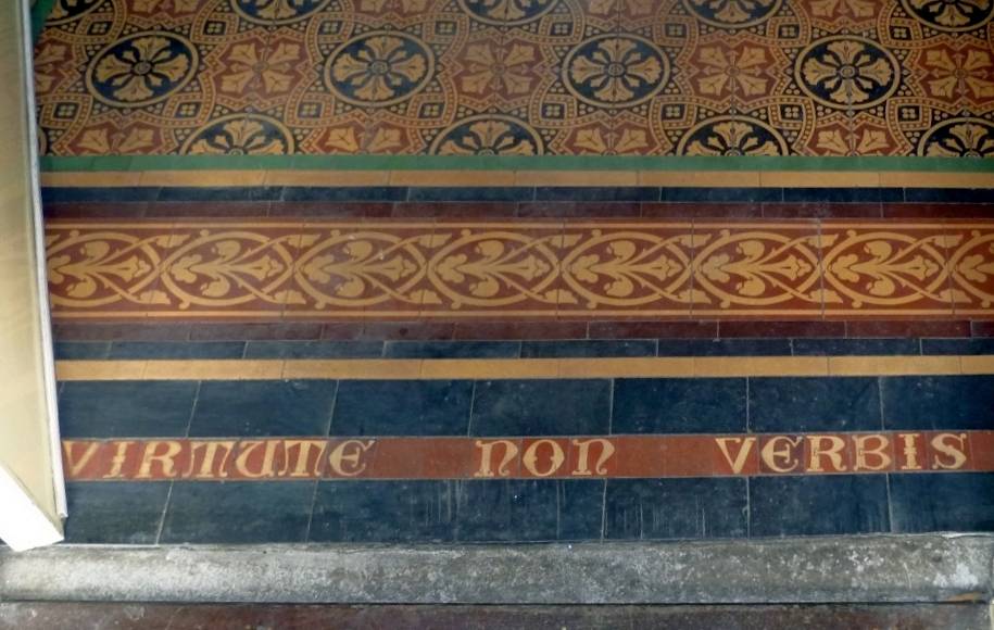 Left: Floor at the main entrance, with the threshold text "By virtue, not by words" (or simply "Deeds, not words") and elaborately bordered tiling. Right: Ironwork on the stairwell.