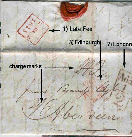 1. a clear, boxed ‘LATE FEE’ date stamp in red. The 'Late Fee' system was in use from 1790 at the Chief Office of the General Post in London. It cost 6d (six pence) and had to be paid when the letter was lodged and only between 7pm and 7.45pm to ensure despatch of the letter in that night's mails. The mail counter closed at 7 pm, but the mails were actually despatched at 8 pm. There were three different postmarks while the system was in effect. First a square frame, then a circular frame and then a square frame again. This square one was used from 1813 until the early 1850s. As they were pre-paid, they were usually applied in red ink. This example showing the date as 2 MA 2 1815 left London that night, and travelled to Aberdeen via Edinburgh.