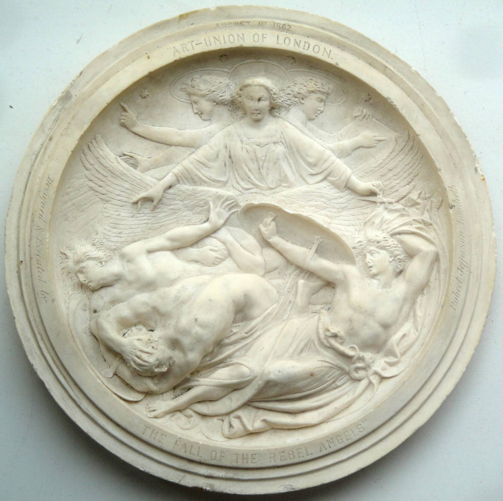 The Fall of the Rebel Angels ” by Robert Jefferson. Parianware, 8 ¼ inches diameter. Inscription: “August 1st, 1862 / Art-Union of London / Designed and executed by Robert Jefferson, Lambeth / The Fall of the Rebel Angels.” Private Collection. [Click twice on image to enlarge it.]
