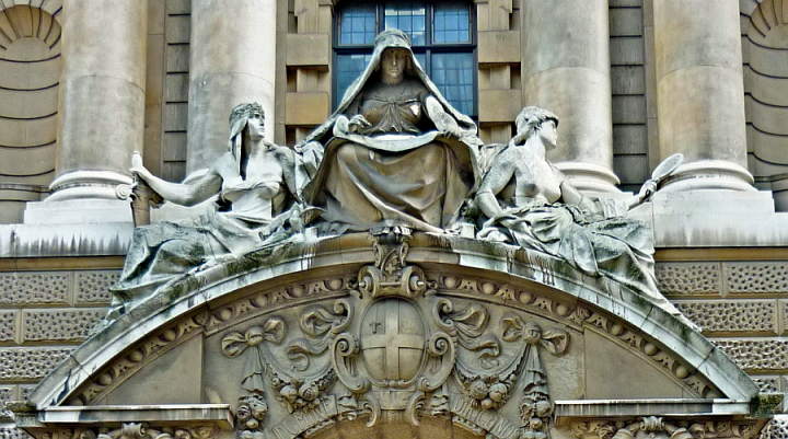 Fortitude and Truth flanking a recording angel above the City of London Arms (see Ward-Jackson 64) by Frederick William Pomeroy. 1905-6. Portland stone. Above the entrance to E. W. Mountford's Central Criminal Court, the Old Bailey, London. [Additional images, including details] Click on image to enlarge it.