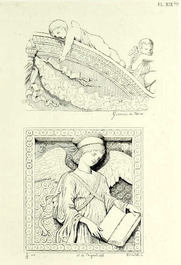 Top: "Upper portion of the terra-cotta altar in the church of the Eremitani at Padua” by Giovanni da Pisa, the scholar of Donatello"; bottom: "Angel from the altar by Donatello in the chapel of the Sacrament at Sant' Antonio at Padua" (Perkins, Appendix, following p.274). Charles Perkins explains in his brief preface, "To this volume is added an Appendix, containing some additional matter, corrected dates, and four plates engraved for M. Charles Haussoullier's French Translation of 'Tuscan Sculptors.'" Of these plates, two were of Triqueti's drawings.