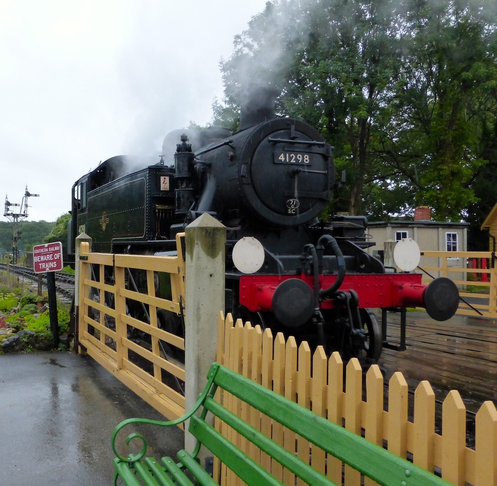 A locomotive comes into the station just after the signal-man has changed the points. (The timetable tells us that the Ivatt Class 2 NO.41298 locomotive dates from 1951, and so is more recent than some of the other locomotives here. George Ivatt [1886-1976], who designed it, was the son of Henry Ivatt [1851-1923], Chief Mechanical Engineer of the Great Northern Railway from 1896 to 1911.)