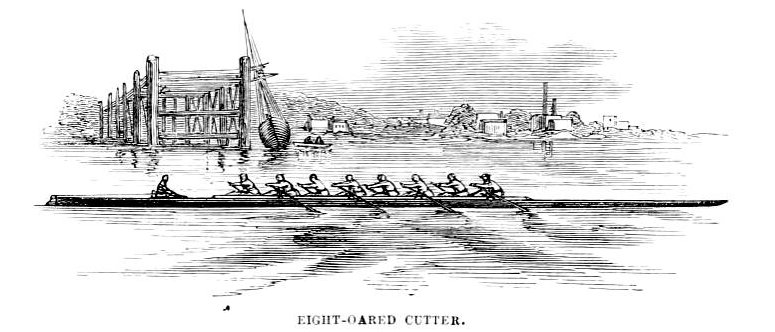 The Eight-oared cutter. 1859. From The Book of the Thames from its Rise to its Fall, p. 394. “Cutters is the general term used on the Thames for long oared boats, built for four, six, or eight rowers; they are outrigged, and covered at the head and stern with canvas: the eight-oared boats are seventy feet long” (394).